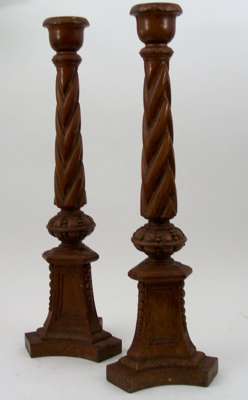 A large pair of early 19th century painted altar candlesticks,