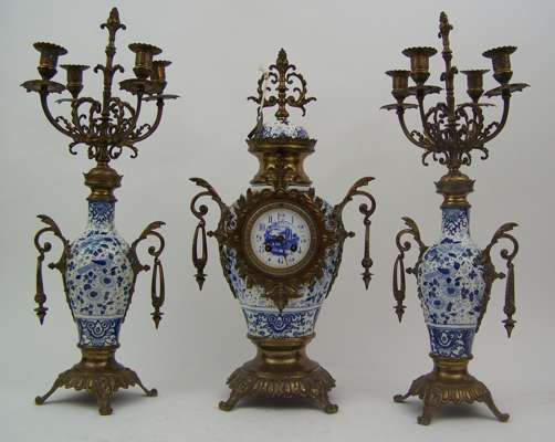A late 19th century gilt metal and ceramic clock garniture,