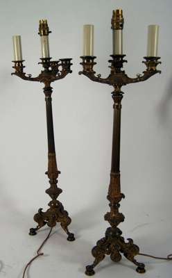 A pair of 19th century French gilt brass three branch candelabra,