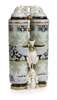 of double cylinder form, the scrolling handle above two circular covers, united by a gilt ball, the body with bands of moulded stylised foliage in white on pale green and black ground, the two cylinders conjoined by a griffin with a gilt loop in its beak, standing on a Chinese style mythical beast to each side, impressed mark and number 1624