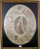 probably Scottish, each of oval form, one depicting a lady in a bower, within a meandering floral border, 52cm high; the other depicting a shepherdess with her flock within similar border, each with gilt and black verre eglomise mounts and gilt frames, 49cm high (2)