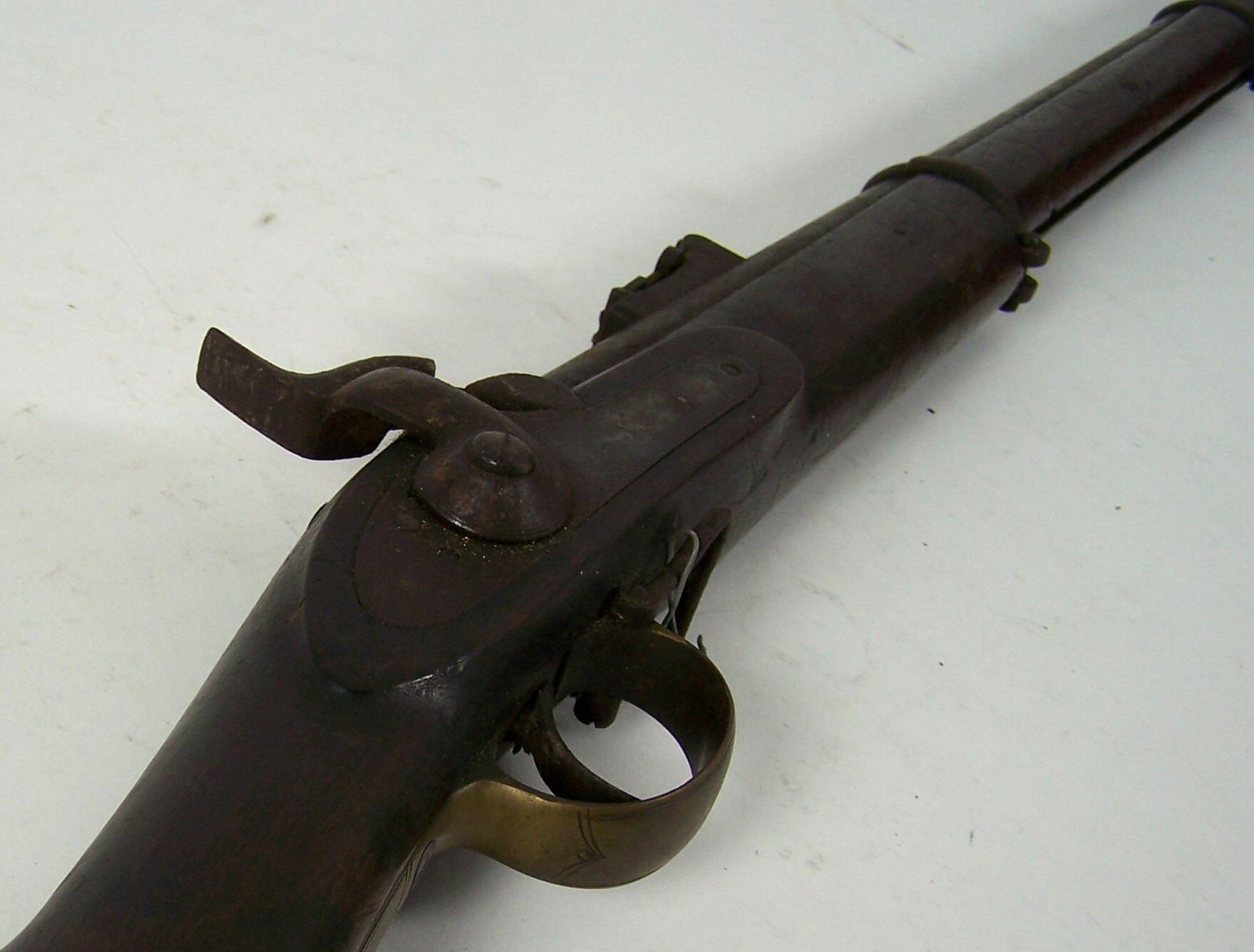 the lock signed A. Henry with brass butt plate and trigger guard, sling swivel at trigger guard and muzzle, signed Alex Henry, Edinburgh on the top of the barrel behind the back, slight walnut full stock with three bands to contain the barrel, the forward band with bayonet lugg missing its steel ram rod, c1858
