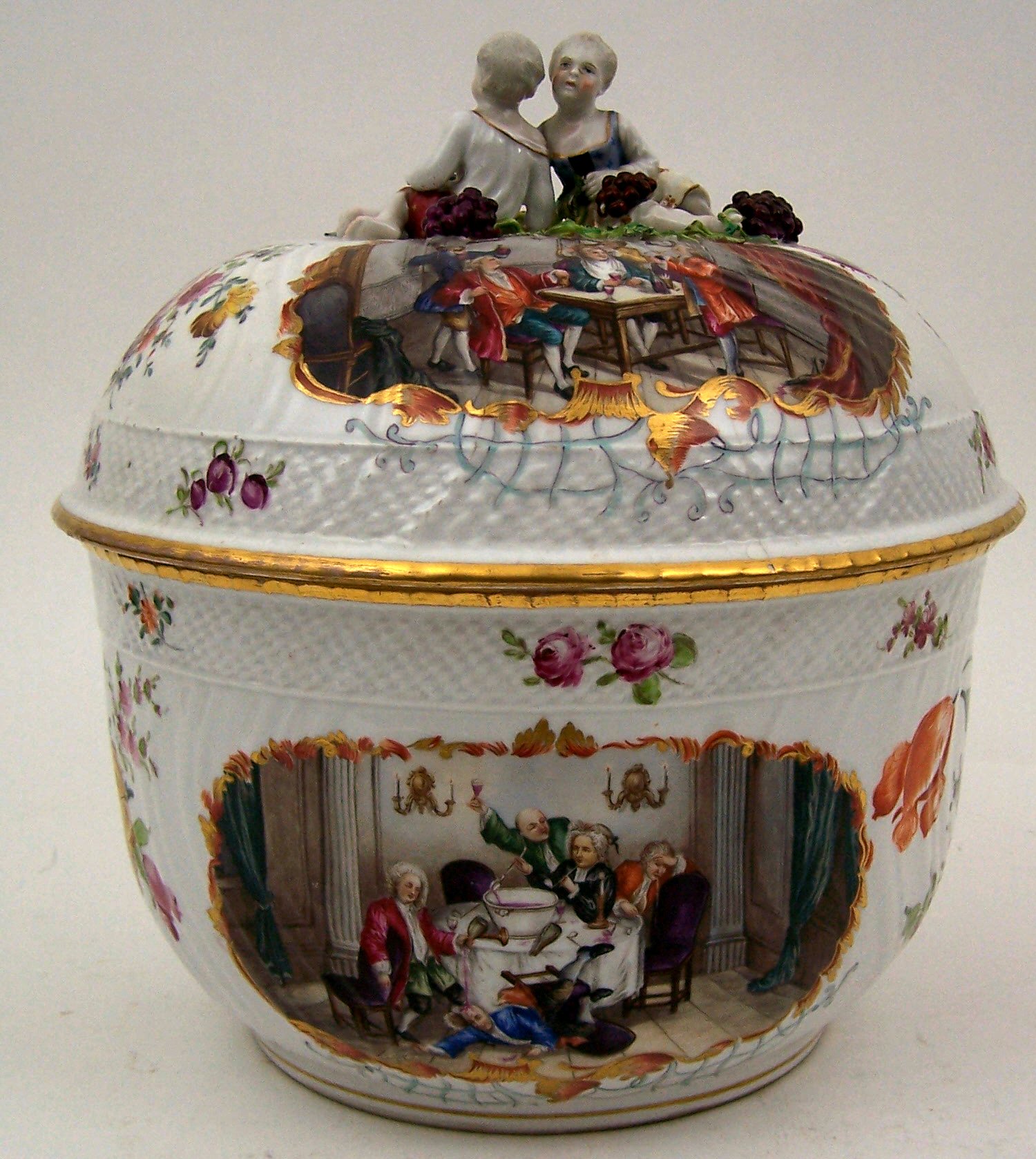 the cover with finial in the form of a boy and girl surrounded by moulded grapes and vine leaves, above opposed panels of 18th century figures drinking at table, interspersed with floral sprays, with basket moulded border above gilt rim, the body with similar rim and border, with similar decoration, the figures in a state of inebriation, blue painted mark