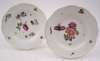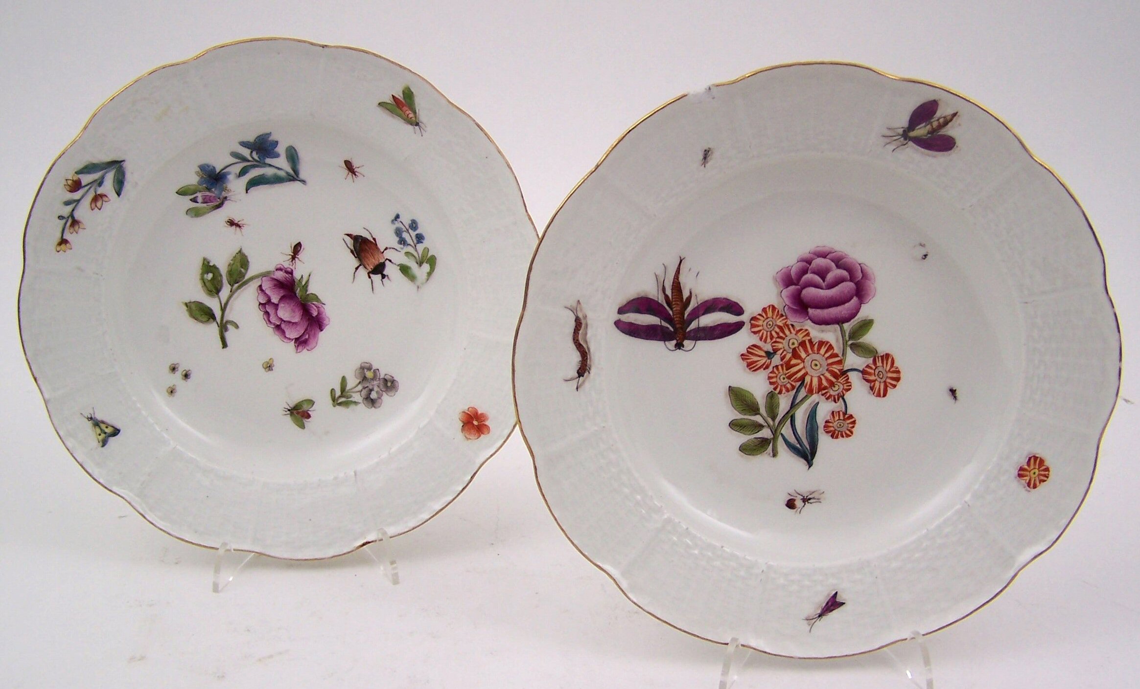 each with scalloped gilt rim and basket moulded border, the well painted with central purple flower spray, further smaller flower sprays, large and small insects, blue painted mark (2)