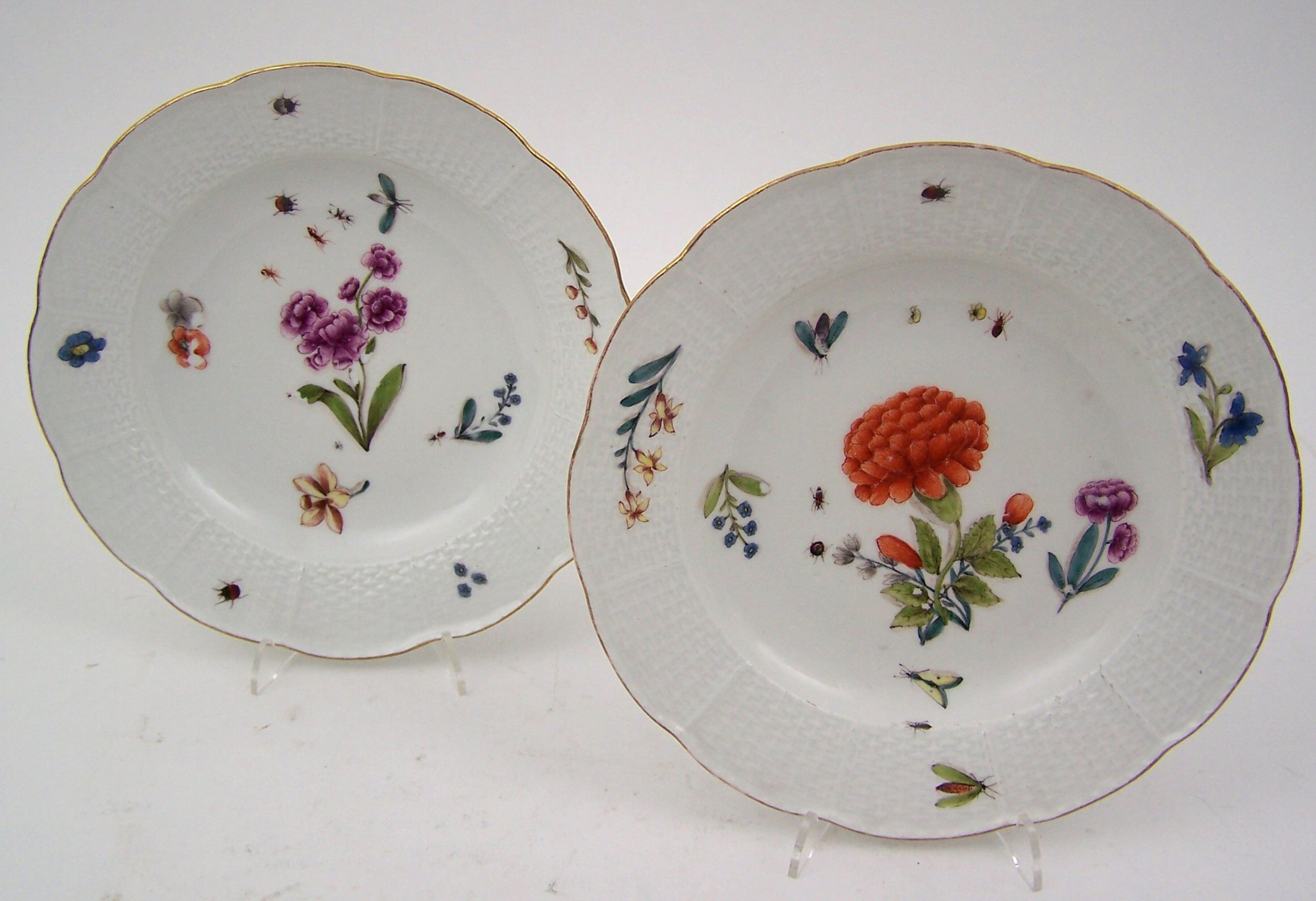 each with scalloped gilt rim and basket moulded border, the well painted with central purple flower spray, further smaller flower sprays and insects, blue painted mark (2)