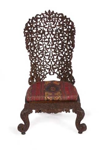 the tall arched back with profusely carved and pierced lattice above carved seat rail with drop in cane seat and boldly scrolled acanthus carved front legs