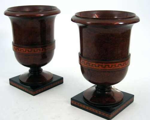 figured to simulate marble, with satinwood inlaid Greek key bands, the spreading feet on ebonised bases with lozenge banding (2)