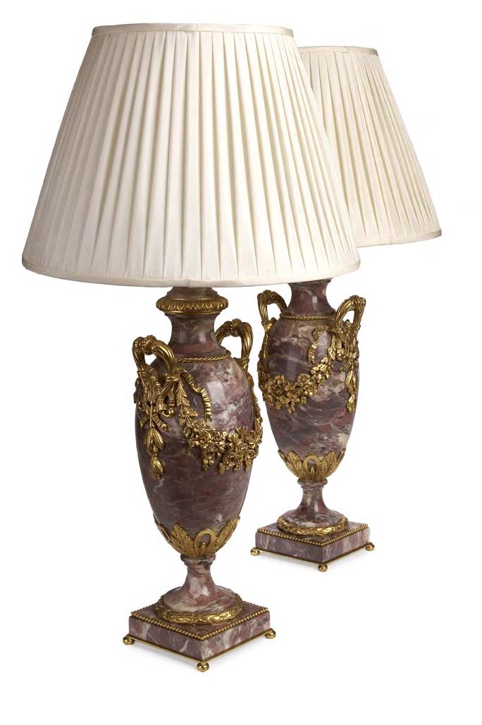 A pair of Louis XV style rouge marble and gilt metal mounted urns,