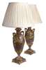 with rope twist and husk cast handles and foliate leaf garlands to the front, the plinth bases with gilt beaded edges and bun feet, (sold with pleated cream shades) (2)