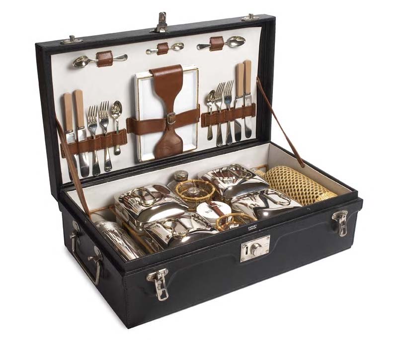 the rectangular black leather case enclosing four earthenware sandwich plates, cutlery, butter dish and cover, wicker covered glass bottle and glasses etc, stamped makers mark
