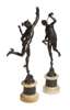 Two French bronze figures, circa 1900; Mercury with sceptre and supported on a head emblematic of wind; Fortuna bearing a trumpet and supported on a wheel, on marble and cherub cast bases (2)