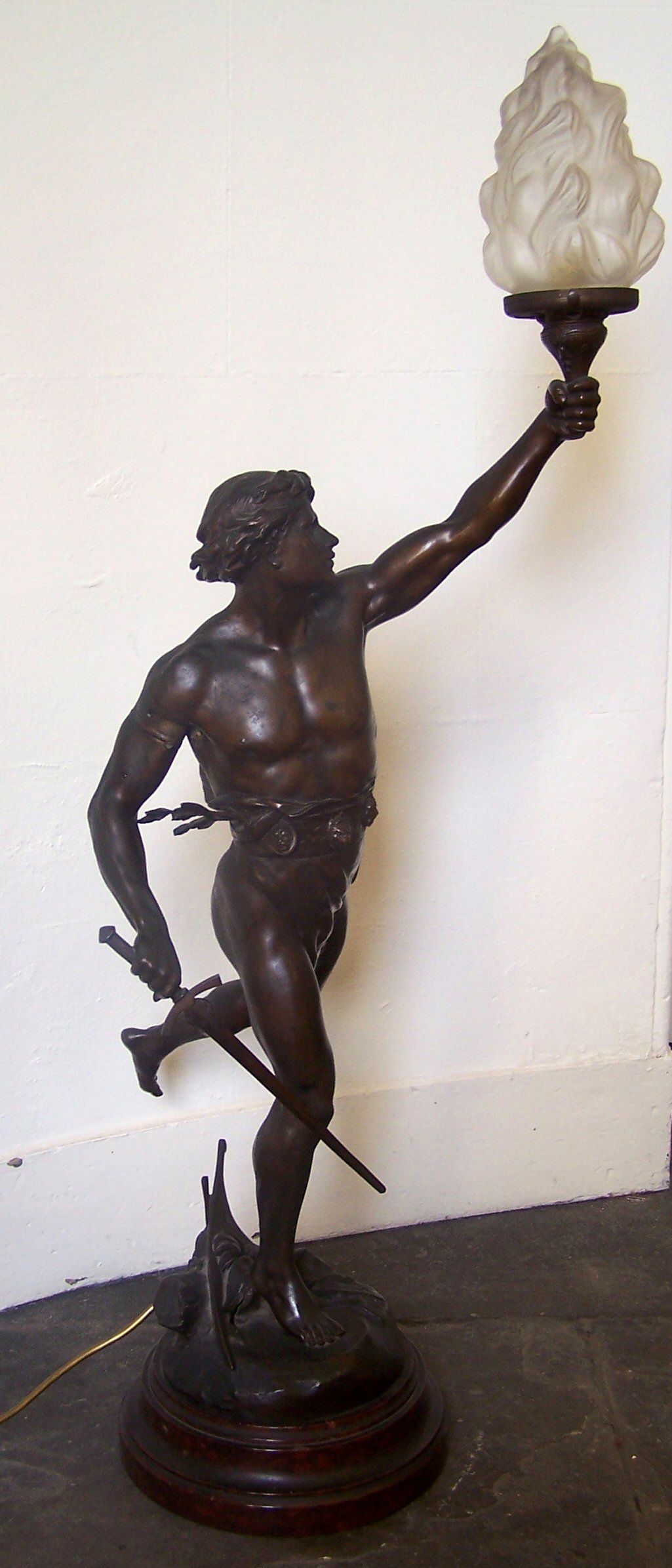 late 19th century, spelter, signed on the base 'E.PICAULT', on a rouge marble circular base (wired for electricity and including frosted shade)