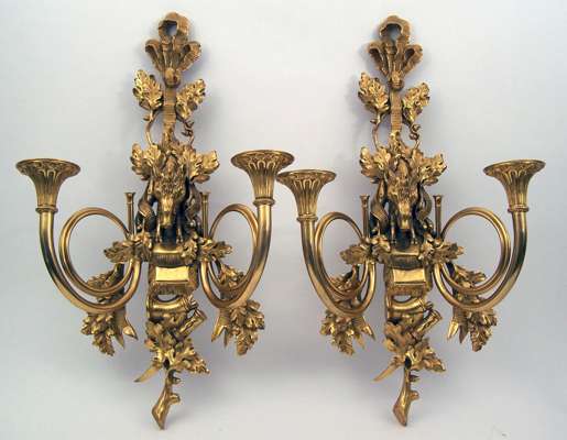 of Louis XV style, each with back plate cast with tied ribbon suspending boar's head above bag, powder flask and knife, surrounded by oak leaves, issuing two scrolled candle branches modelled as French horns, with spreading circular fluted sconces