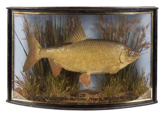 in a naturalistic river setting, within a bowed glazed case inscribed, "ROACH Caught by JDS. Smith in the River Severn, 1910. Weight 7ln 131/4 oz's"