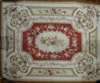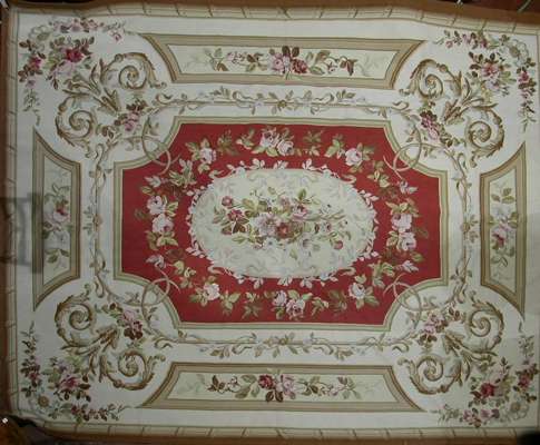 the rust red field with central oval floral cream medallion, similar wide border with scrolled and floral oval corners
