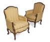 each with upholstered backs enclosed by moulded frames, the arms with moulded uprights enclosing loose squab cushions, the whole raised on moulded cabriole legs with scroll toes (2)
