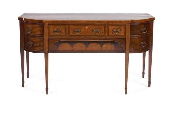 of semi bowed form, the crossbanded top above three central drawers with a single drawer below inlaid with arcaded decoration, flanked one side with a deep cellar drawer with sabre drawer front and to the other with two drawers, the whole raised on square tapering legs terminating in spade feet