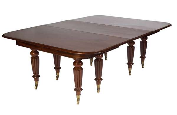 the moulded rectangular top with rounded angles above turned and reeded legs ending in brass cappings and castors, includes three additional leaves