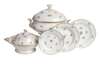 with gilt line decoration and painted with delicate flower sprigs on a white ground, comprising: ten meat plates; eleven fish plates; nine side plates; ten dessert bowls; two saucers, all with scalloped edges; a sauce boat; a salt and pepper dish; a small circular tureen and cover; a large footed circular tureen and cover; a large oval footed tureen and cover; a circular serving dish, 32cm diameter; a large oval ashet, 47.5cm wide; a small oval ashet, 43cm wide; and a fish dish, 55cm long (54)