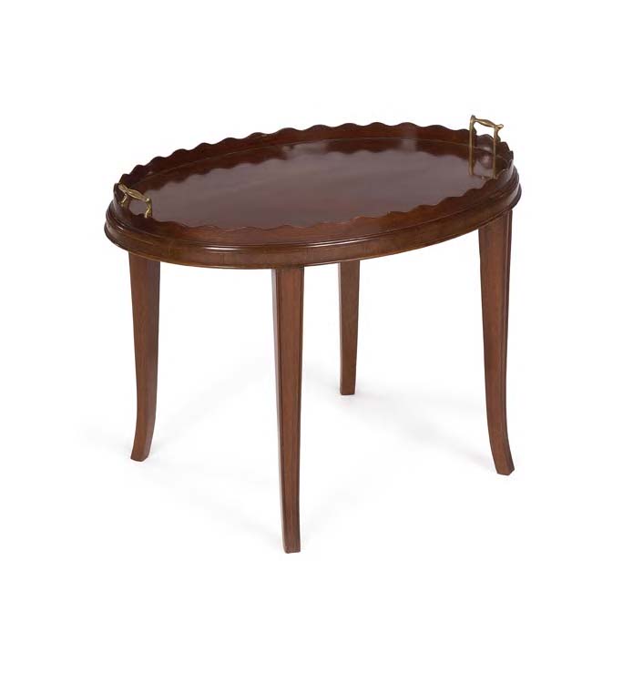 the removable waved galleried oval tray with twin brass handles, the baize lined stand on square tapered outswept legs (2)