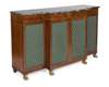with later green marble top, above a flame veneer frieze, over two central brass lattice and fabric panelled doors, flanked on each side by a similar door, on gilt-brass hairy paw feet