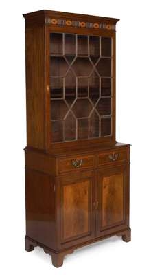 20th century with 18th century elements, the moulded cornice above fluted and oval batswing patera inlaid frieze, above an astragal glazed door, enclosing adjustable shelves, the crossbanded and boxwood strung projecting lower section with two short drawers above two panelled cupboard doors enclosing a shelf, on bracket feet