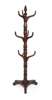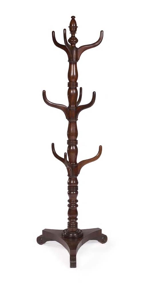 the ring and baluster turned column with acorn finial, issuing three tiers of three upscrolled hat branches on concave tripartite base with reeded scroll feet