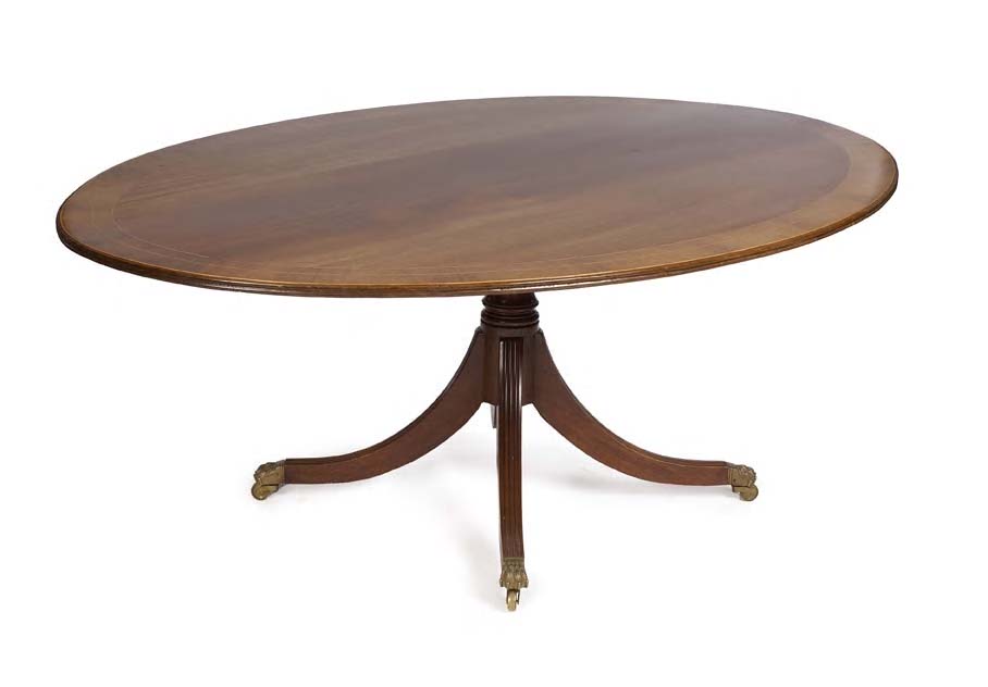 of George III style, the oval top with boxwood stringing and crossbanded edge, raised on ring turned column with four reeded sabre legs terminating in brass hairy paw caps and castors