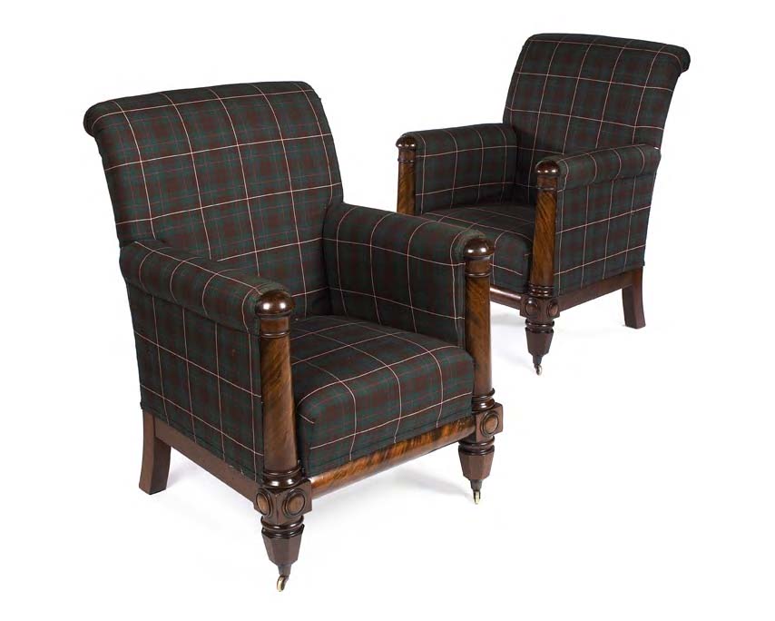 each with outscrolled back, arms and seat covered in green tartan fabric, with turned demi-column arm supports, on octagonal tapering legs with metal caps and castors (2)