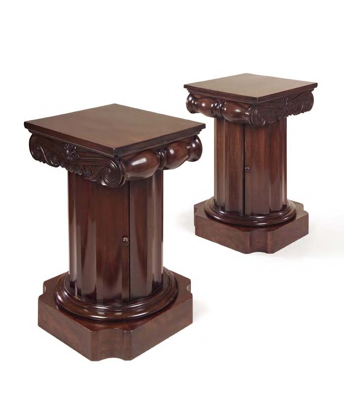 each with rectangular top above scrolled and egg and dart moulded frieze, centred by an anthemion, with drawer to one side, above cylindrical fluted column with cupboard door, on circular moulded base and shaped plinth (2)
