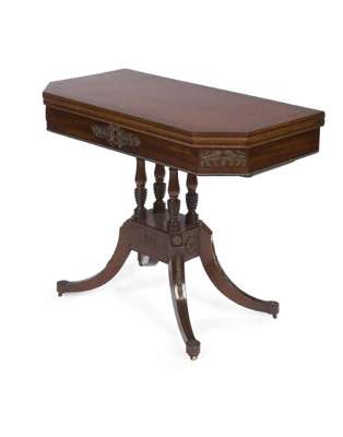 with purplewood banding, the cross banded top with canted angles above plain freize with applied empire style gilt brass mounts raised on four ring turned columns and quadruped base with sqare section sabre legs and castors, similar applied mounts
