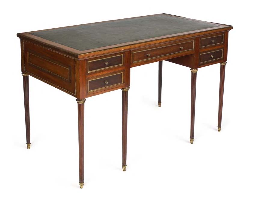 with gilt brass mounts, the rectangular top with inset leather skiver above arrangement of five panelled drawers around knee hole raised on fluted tapering turned legs with engine turned capitals and toupie feet