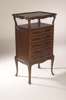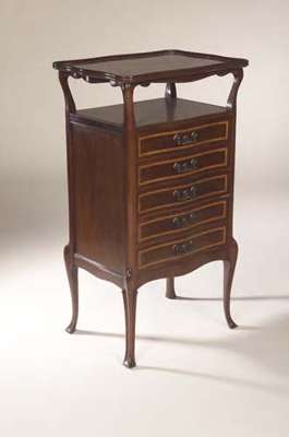 by Danby & Spinks, the serpentine rectangular tray top above open shelf and five satinwood banded serpentine drawers with patent hinged fronts and copper handles with moulded cabriole legs