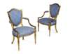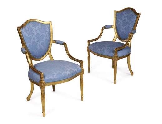 each with moulded frame, the shield shaped back with upholstered panel above down scrolled arms and bow fronted stuff over seat, turned and fluted tapering front legs with rosette terminals (2)