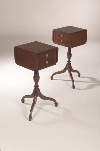 each with rectangular top with reeded edge and drop flap above two graduated drawers over a raised and turned pediment and down scrolled legs on splayed feet