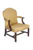 the arched back with serpentine seat and moulded scrolling open arms covered in patterned gold fabric, on square moulded legs joined by an H-shaped stretcher ending in brass castors