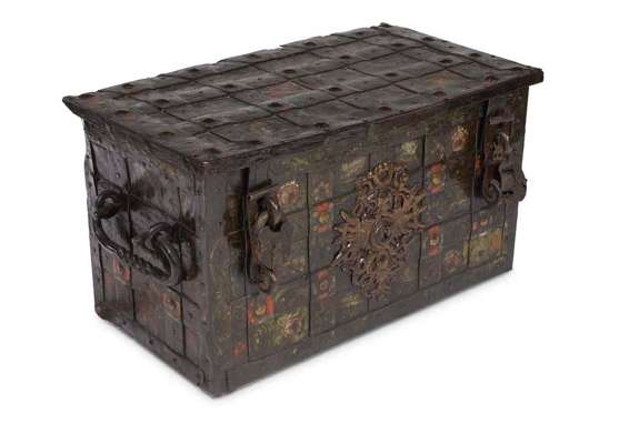A large South German iron bound and overpainted casket, 16th century,