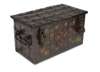 with wrought iron side carrying handles and faint later overpainted decoration throughout, in particular to the front; flowerheads, roses, tulips etc and obscure landscape scenes, the central lock with eagle escutcheon (with large key, two padlocks and two smaller keys)