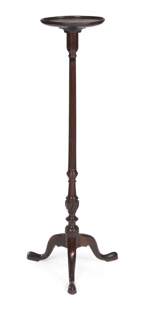 the top possibly associated, the dished circular top on a spirally fluted turned stem with triple cabriole legs and pad feet