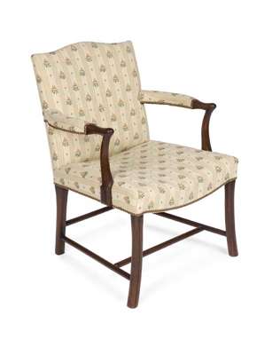 the shaped back, padded open arms and seat covered in a striped patterned fabric, the 'Cockpen' type front legs joined by an H-shaped stretcher