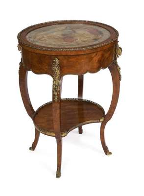 with giltmetal mounts, the oval glazed and hinged lid incorporating a floral watercolour, the veneered interior formerly with a tray, the square tapering cabriole legs with rams mask decoration, joined by a galleried kidney-shaped undertier