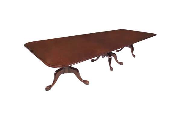 of Georgian style, 20th century, comprising: two end sections and a central section, the rounded rectangular moulded top on three turned columns, the end two with three downswept cabriole legs with pad feet, the central column with four legs