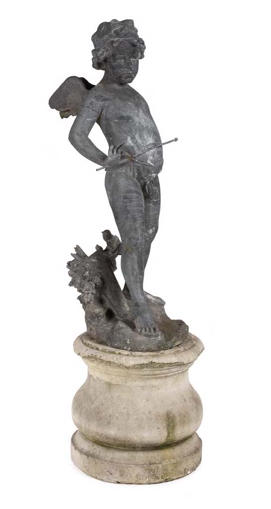 the lead figure holding a bow and arrow and raised on a naturalistic base with flower filled quiver, associated stone baluster stand (damages) (2)