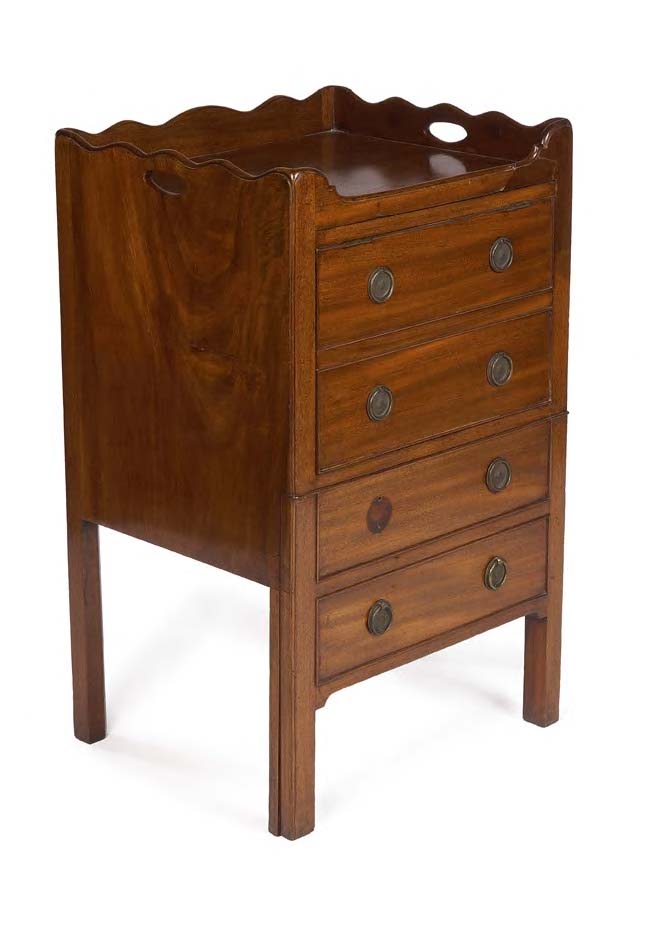 the waved gallery with pierced carrying handles above a rectangular top and lift out door with false drawer front and with pull out commode drawer below with similar frontage and with moulded and divided square legs to the front