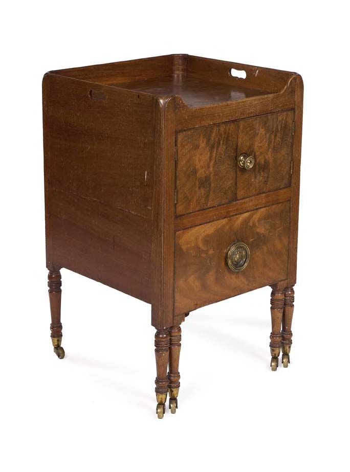 with galleried rectangular top with cut out handles above twin cupboard doors and pull out commode drawer below, raised above two pairs of turned legs to the front, terminating in brass caps and castors