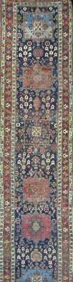 the indigo field with nine polychrome square medallions, within red geometric vine border between ivory bands (worn and reduced)
