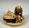 with a paintbrush and ink block in his hands, seated beside landscape models, on an oval footed plinth, red seal mark