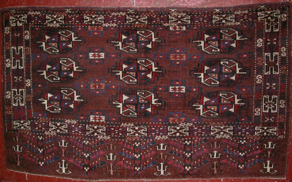 each with brown field with three columns of three guls, within geometric border, serrated skirt to one end (2)