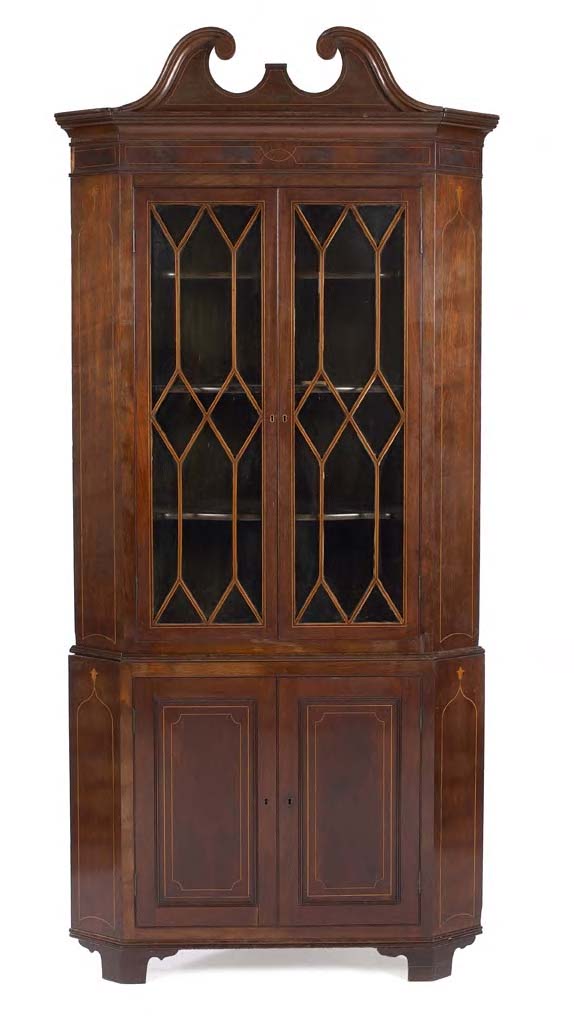 A George III mahogany and boxwood strung corner cabinet,