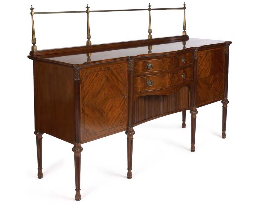 inlaid with stringing, the rear brass columnar rail above two serpentine central drawers and a pair of tambour cupboard doors, flanked by satinwood banded cupboard doors, one enclosing a leaded cellaret drawer, the whole divided by acanthus carved reeded pilasters and ending in tapered reeded legs